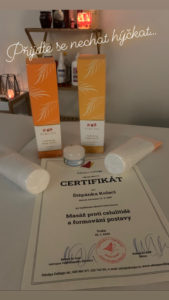 Velmi si vážím Vaší přízně a proto se neustále učím nové techniky masáží, abych Vám mohla dopřát tu nejlepší péči. Tentokrát jsem se vypravila na kurz Masáž proti celulitidě a formování postavy. Tato masáž je opravdu skvělá relaxace, vyzkoušeno na vlastní kůži.